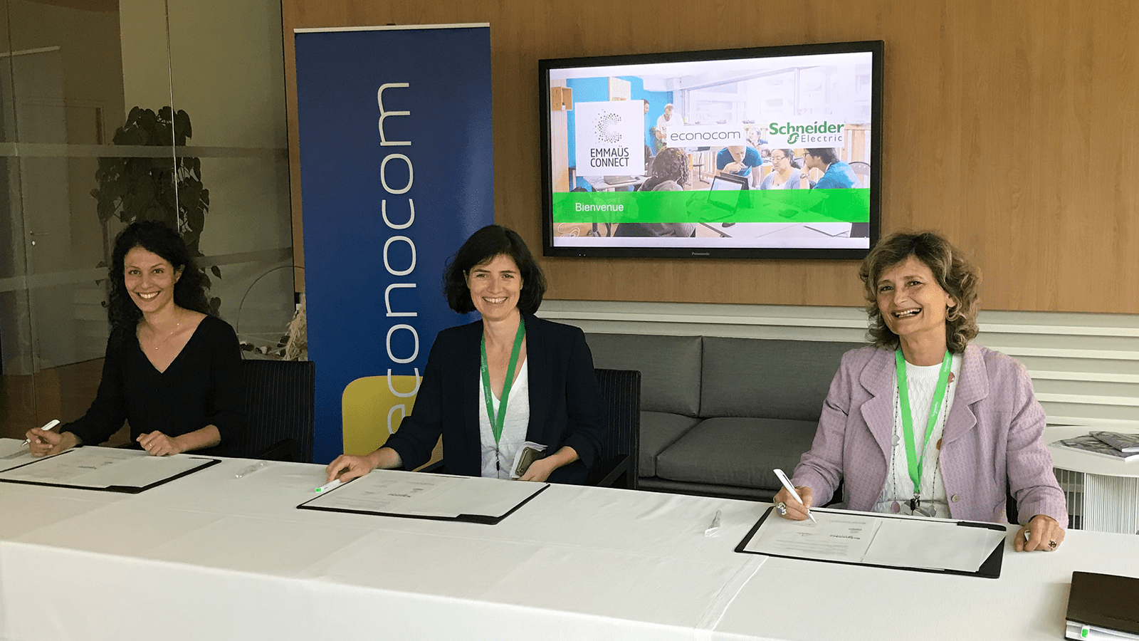 Schneider Electric et Econocom s’engagent à donner 300 PC par an sur 3 ans à Emmaüs Connect. Schneider Electric, le leader de la transformation numérique de la gestion de l’énergie et des automatismes, Econocom, première Entreprise Générale du Digital avec une expertise 360° au travers du financement de projets, la distribution d’équipements et de services numériques, et Emmaüs Connect, acteur clé de la lutte contre l’exclusion numérique des publics en