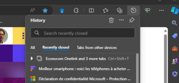 • Menu historique : AccĂ©dez Ă  la section « RĂ©cemment fermé » dans le menu historique et sĂ©lectionnez le groupe d’onglets ou la page que vous souhaitez restaurer.