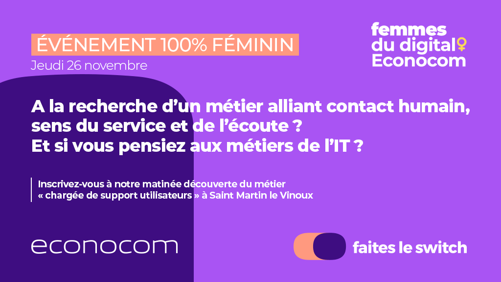 Econocom a à cœur de contribuer à la reconversion professionnelle. Grâce à notre programme Femmes du digital, une journée découverte du métier « Chargée de support utilisateurs » est organisée sur le site de Saint-Martin-Le-Vinoux le 26 novembre prochain. Un job dating 100% féminin pour contribuer à la reconversion et attirer plus de femmes dans les métiers de l’IT.