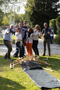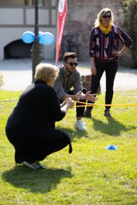 Der Tag begann für uns alle mit einem gemeinsamen Mittagessen in der Kantine, bevor wir uns gut gestärkt auf den Weg zum Jagdschloss machten. Dort angekommen, startete das Fest mit einer aufregenden Team-Challenge. Die Mitarbeiter wurden in 9 Teams aufgeteilt, erhielten jeweils eine Teamfarbe und durften sich kreative Gruppennamen aussuchen. In 3er-Teams traten wir dann in verschiedenen Disziplinen gegeneinander an – von Wikinger-Schach über Brückenbau bis hin zu Cross-Golf und weiteren spannenden Aufgaben.