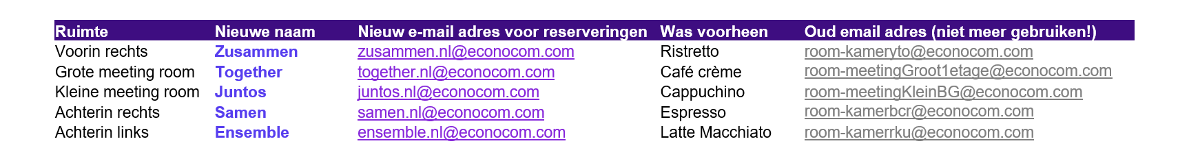 Het spreekt voor zich dat we de andere namen niet meer gebruiken en ook de email adressen die gebruikt werden om de ruimte te boeken zo snel mogelijk vergeten.