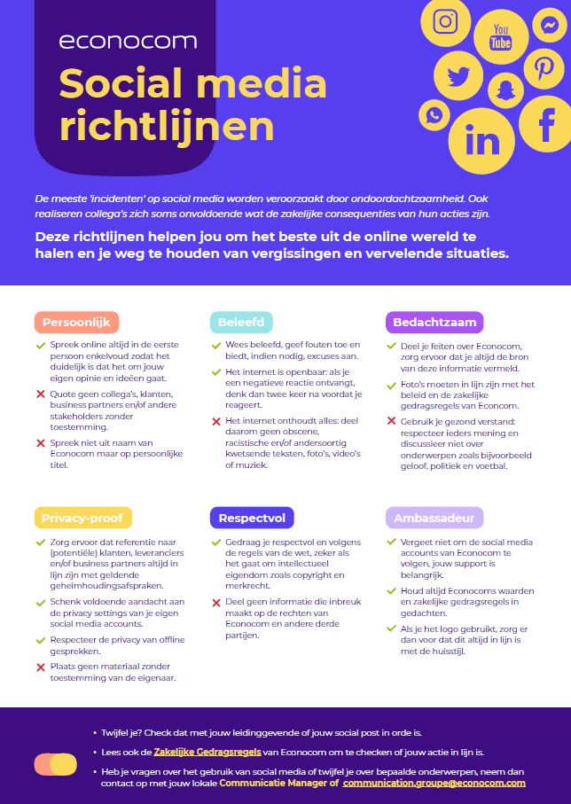 De meeste ‘incidenten’ die zich op sociale media voordoen zijn het gevolg van te snel en ondoordacht handelen. Als medewerker ben jij jezelf niet altijd volledig bewust wat de impact van jouw acties en gedrag is voor de reputatie van Econocom.